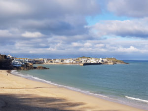 View of Porthminster beach and St. Ives harbour on a sunny morning in winter.